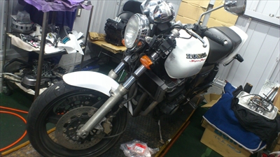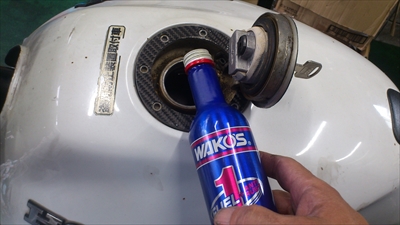 さて頭文字Oさんのエクセディ―の社員さんの車両 ホンダ CB400SF versionSの車検整備をしています。 24か月点検をしてプラグ エアークリーナー エンジンオイル ブレーキ液などなど整備をし車検の為のガス検査対策のためにワコースフューエルワンを入れて対策しています。
