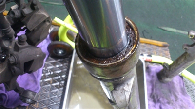 他のお店で修理依頼見積りを頼んだらしいのですが よくある2輪間とかその辺みたいですがダストシールとフォークシールが劣化しすぎてゴム変形し割れています。このパターンはちょっとやそっとでは抜けない状態なので他社の見積もりはフォークインナー交換見積りで約15まんぐらいかかるって・・・・・